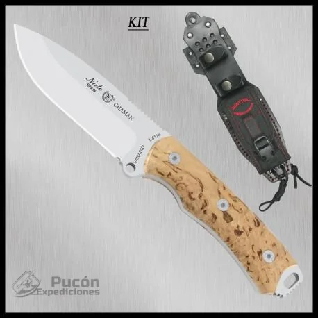 Fabricado en: Albacete (España) – Fabricante: Miguel Nieto – Referencia del catálogo: 140-AK – Tipo de hoja: Polivalente – Longitud de la hoja: 11,5 cms – Longitud del mango: 12.5 cms – Longitud total: 24 cms – Ancho de pala: 3,5 cms – Espesor de la hoja: 5,3 mms – Material de la hoja: Acero Inoxidable Vanadio 1.4116 – Dureza: 56/58 HRc – Material de la empuñadura: Madera natural de abedul – Material de la funda: Cuero de primera calidad multiposición con un cajetín porta utiles de cordura y cierre clip. – Peso: 285 grs – Dentro del cajetín desmontable porta utiles de cordura vienen incluidos los siguientes accesorios: Pedernal con raspador. Silbato. Afilador de diamante. Espejo de señales.