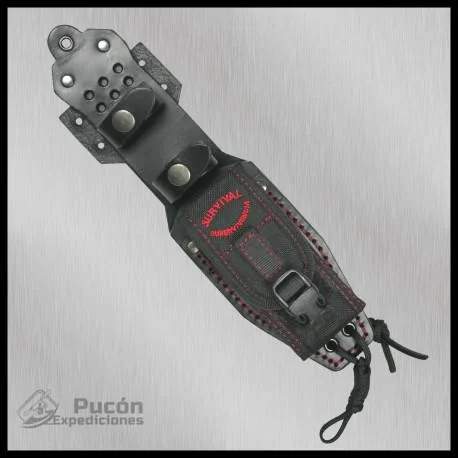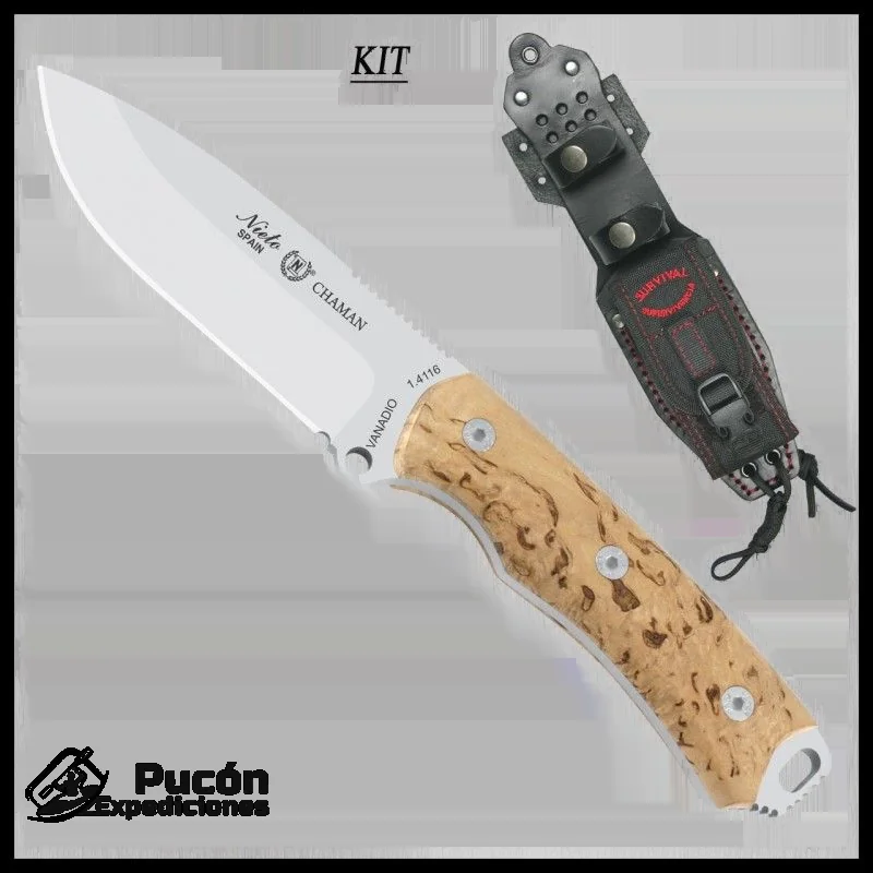 – Extras: Agujeros para cordón fiador para garantizar un mejor agarre. Cercano a la guarda dactilera, presenta un agujero iniciador para hacer fuego mediante fricción con la técnica de arco. Cachas sujetadas por tornillos allen, con la posibilidad de poder intercambiarlas o reemplazarlas por recambios. Pomo percutor o rompecristales con almenado para poder usarse también con un pedernal o firesteel. Zona almenada en la parte del lomo para ayudar en su uso con técnicas de corte preciso o fino. Lomo redondeado para no dañar el palo cuando se usa con técnicas de battoning. Hoja enteriza (full-tang) con punta drop point y vaciado cóncavo. Posibilidad de utilizar el cuchillo como lanza gracias al agujero en la defensa del recazo, que ayudará a la hora de amarrar la pieza al palo. Este modelo ha sido diseñado por la casa Miguel nieto con la colaboración de Manuel de la Torre (Cuchillos MT), artesano el cual ha colaborado con otras marcas nacionales en la creación de modelos superventas en la escena nacional. La funda ha sido diseñada por Oscar Agudo del canal de Youtube Survival Supervivencia 2014. |