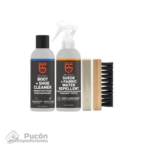 El kit Revivex para el cuidado de zapatos y botas de gamuza es un sistema de mantenimiento todo en uno para calzado de gamuza, nubuck e impermeable y respirable. Incluye un limpiador de gamuza, un cepillo, un bloque de borrador y un repelente al agua que acondiciona y suaviza la gamuza, repele el agua y las manchas y mejora la resspirabilidad. El kit se puede usar en calzado de tela y lona GORE-TEX®, y la fórmula no contiene PFAS.