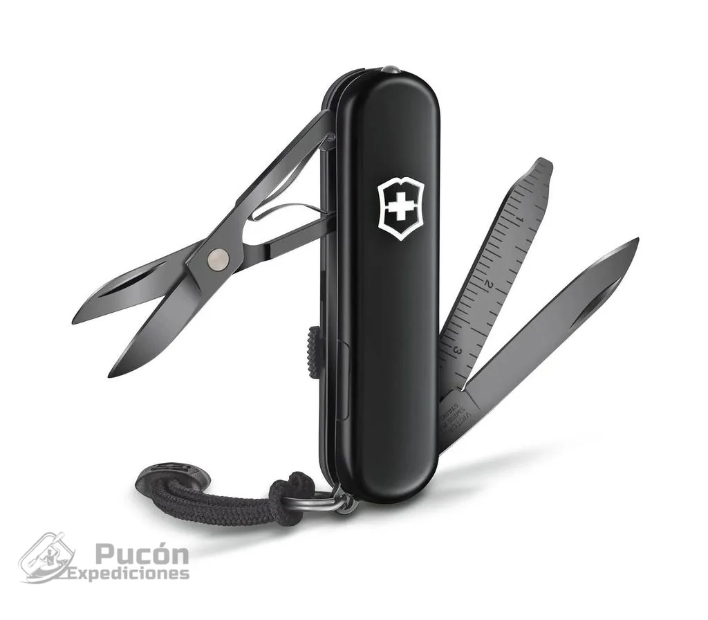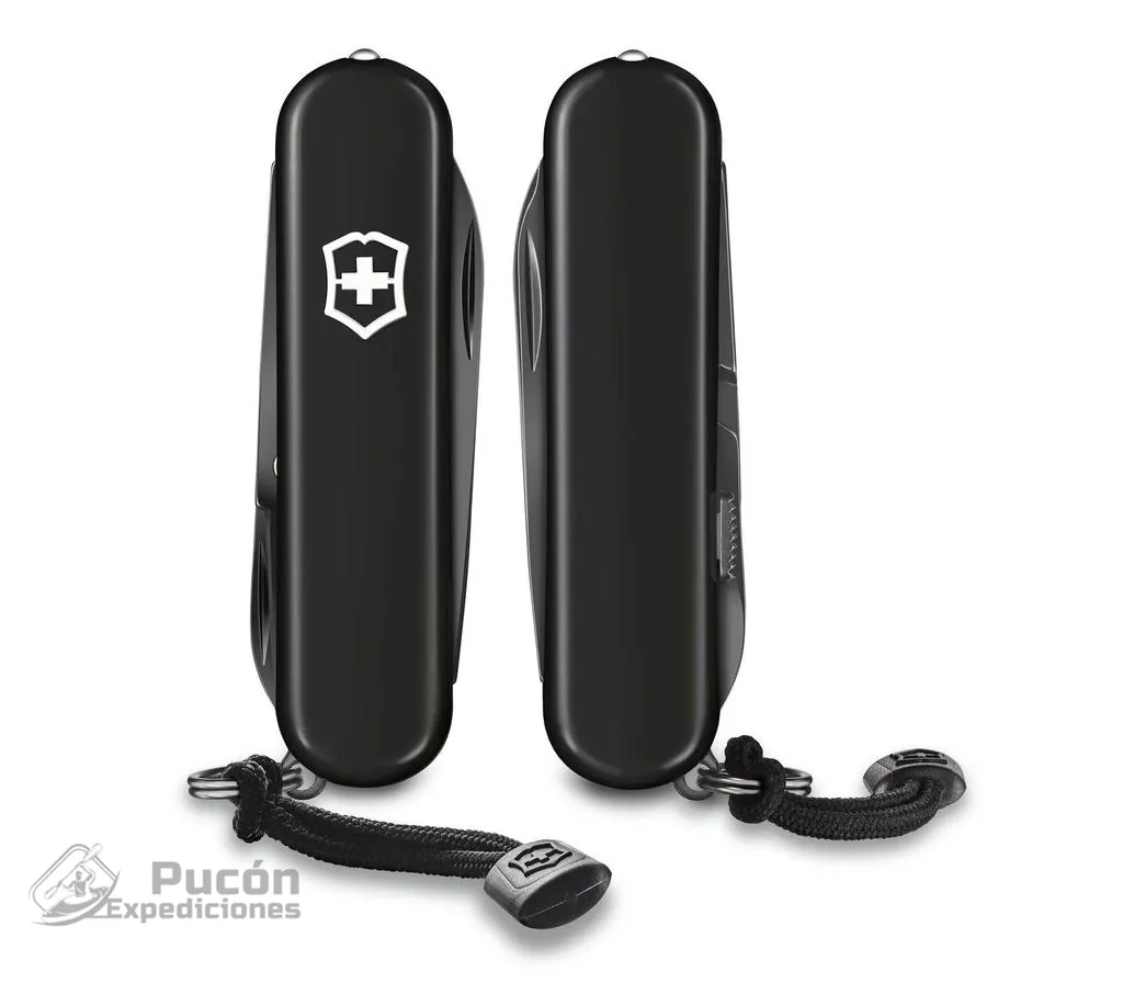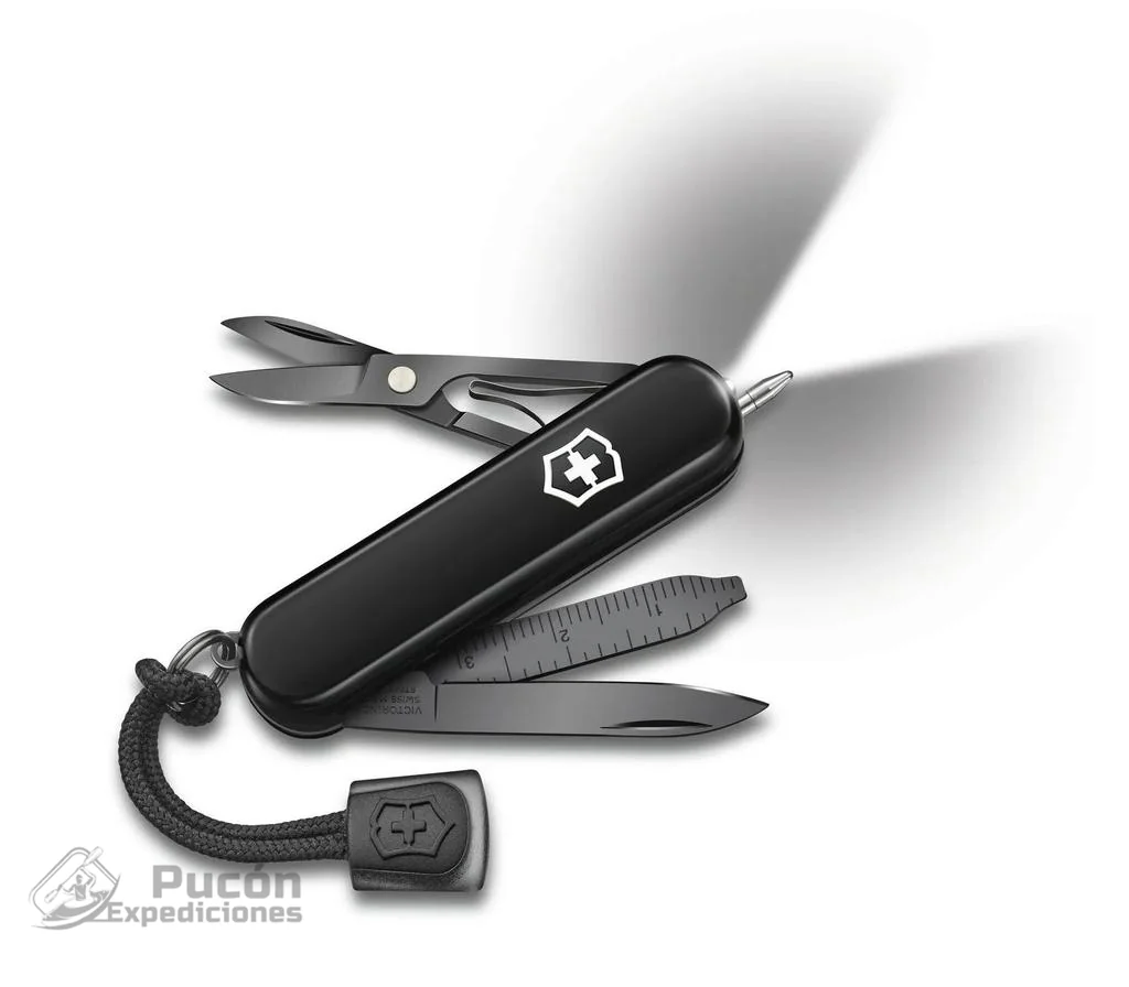 Herramienta esencial para las tareas diarias con acabado negro monocromático. Navaja de bolsillo fabricada en Suiza con 8 funciones. Las funciones incluyen bolígrafo y luz LED.