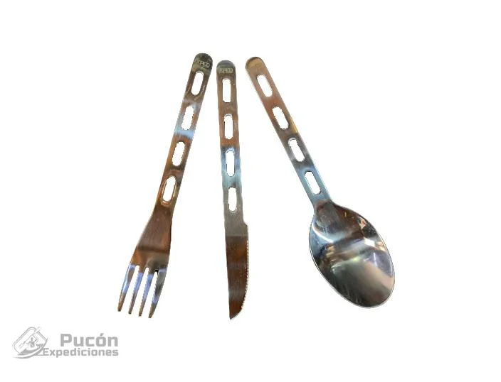 Set de cubiertos fabricados en acero inoxidable. Cuenta con un práctico seguro para mantenerlos inido o colgarlos para que no se pierdan