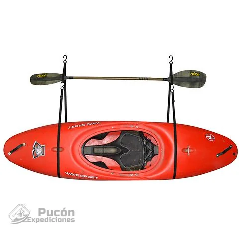 Boat Hanger viene con 2 cancamos, 2 correas de gancho en S de 260 cm de largo que se enrollan hacia atrás y crean una eslinga colgante de 122 cm para su kayak.